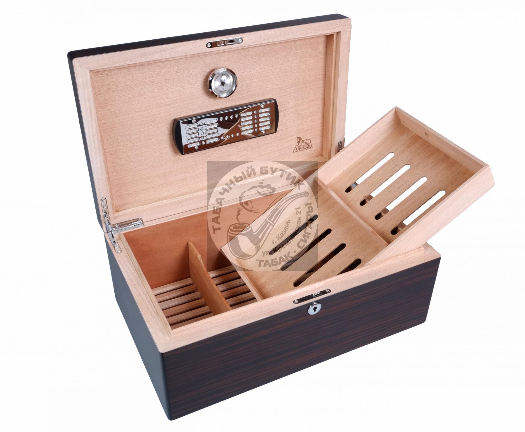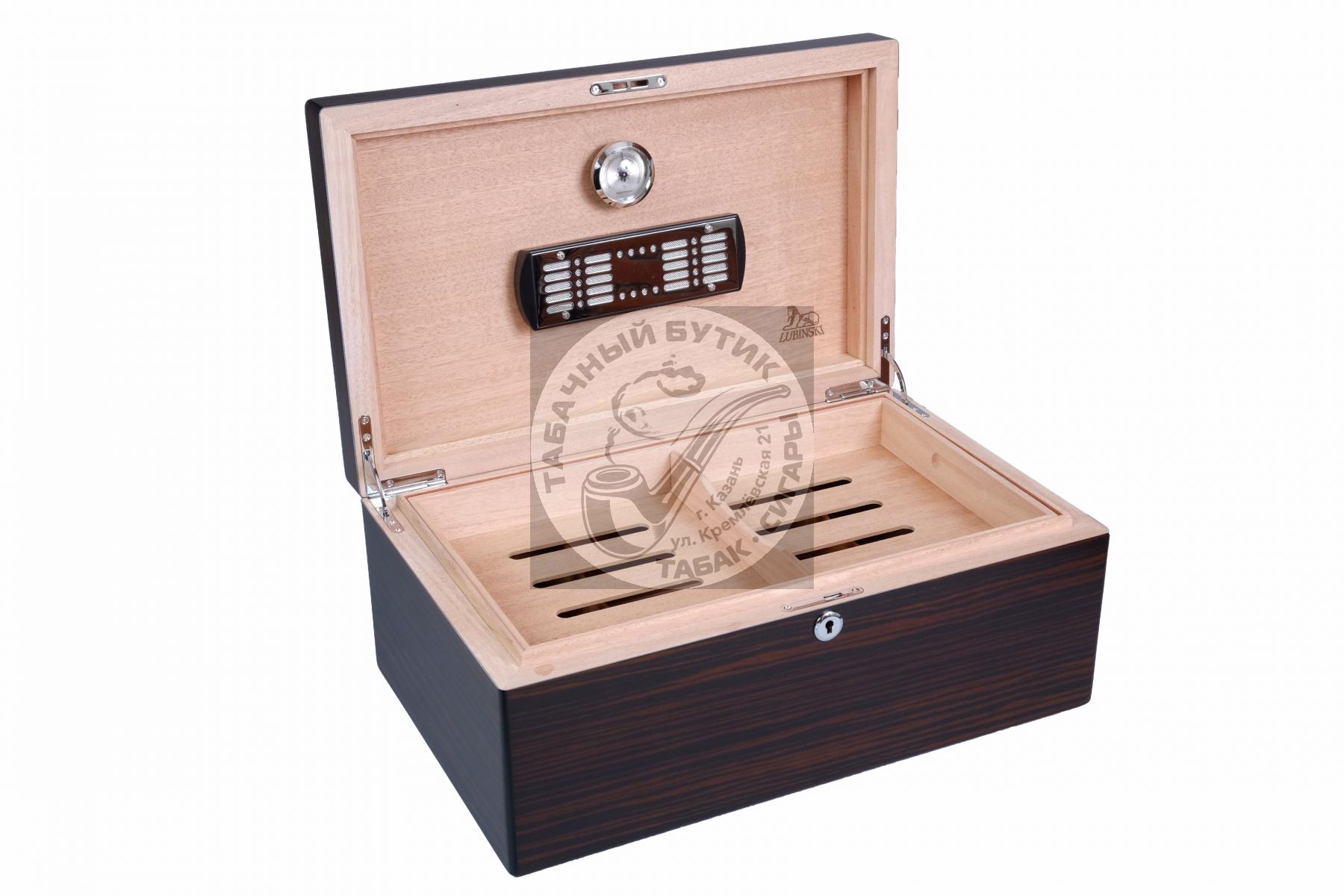 Хьюмидор премиум-класса на 80 сигар от итальянской компании Lubinski — крупнейшего производителя и дистрибьютора курительных аксессуаров в Италии. (Подробнее о компании и ее продукции можно узнать на сайте www.lubinski.it). Массивное и солидное изделие со строгим классическим дизайном и качественным исполнением всех деталей. Внутренняя отделка из Испанского кедра. На дне — съемная кедровая решетка для равномерного увлажнения сигар и вентиляции по всему объему. Корпус отделан ценным шпоном Эбенового дерева (Макассар индонезийский). Матовая лакировка подчеркивает красоту дерева. В комплекте увлажнитель и гигрометр, которые крепятся в любом месте на крышке, благодаря скрытой под кедровым шпоном магнитной пластине. Съемный лоток для сигар с перегородкой, замок с ключом, подробная инструкция по эксплуатации. Тканевый чехол и подарочная коробка в комплекте. Привозим под заказ клиенту.