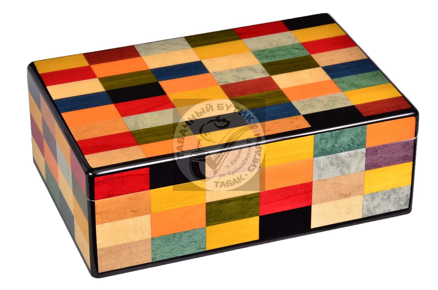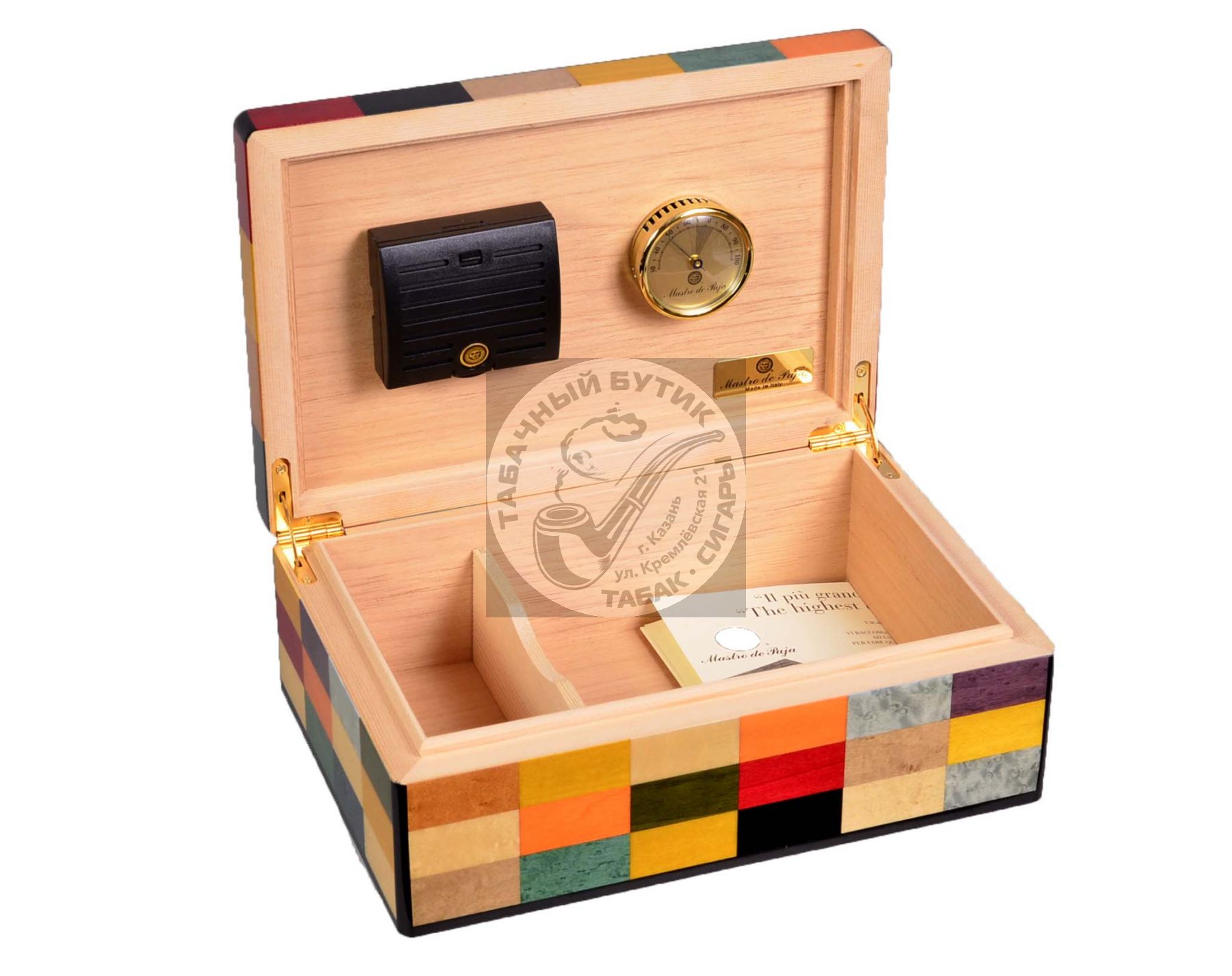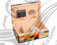 Хьюмидор премиум-класса на 40 сигар из Итальянской мастерской Mastro de Paja (Мастро де Пайа), всемирно известной своими курительными трубками и аксессуарами для сигар, оригинального дизайна и высочайшего качества. Узнать больше о компании и ассортименте можно на сайте www.mastrodepaja.it . В модели Mastro de Paja «Арлекино» используется техника «Маркетри» — один из вариантов инкрустации по дереву: кусочки деревянного шпона разных пород и окраса вручную вырезаются и подгоняются друг к другу по эскизу, затем весь набор под давлением наклеивается на поверхность украшаемого предмета, завершает производство финишное покрытие 6-ю слоями рояльного лака. Корпус хьюмидора представляет собой комбинацию нескольких видов дерева, что обеспечивает стойкость к деформации при колебаниях температуры и влажности (ведь разница во влажности внутри и снаружи хьюмидора может достигать 50%). Внутренняя отделка Mastro de Paja выполнена из испанского кедра, произрастающего в Латинской Америке. В комплекте с хьюмидором идут увлажнитель со шторками и фирменным материалом Mastro de Paja (при пропитке дистиллированной водой материал разбухает и равномерно отдает влагу, не требуя добавления пропиленгликоля), французский гигрометр, подробная инструкция по уходу, подарочная упаковка.