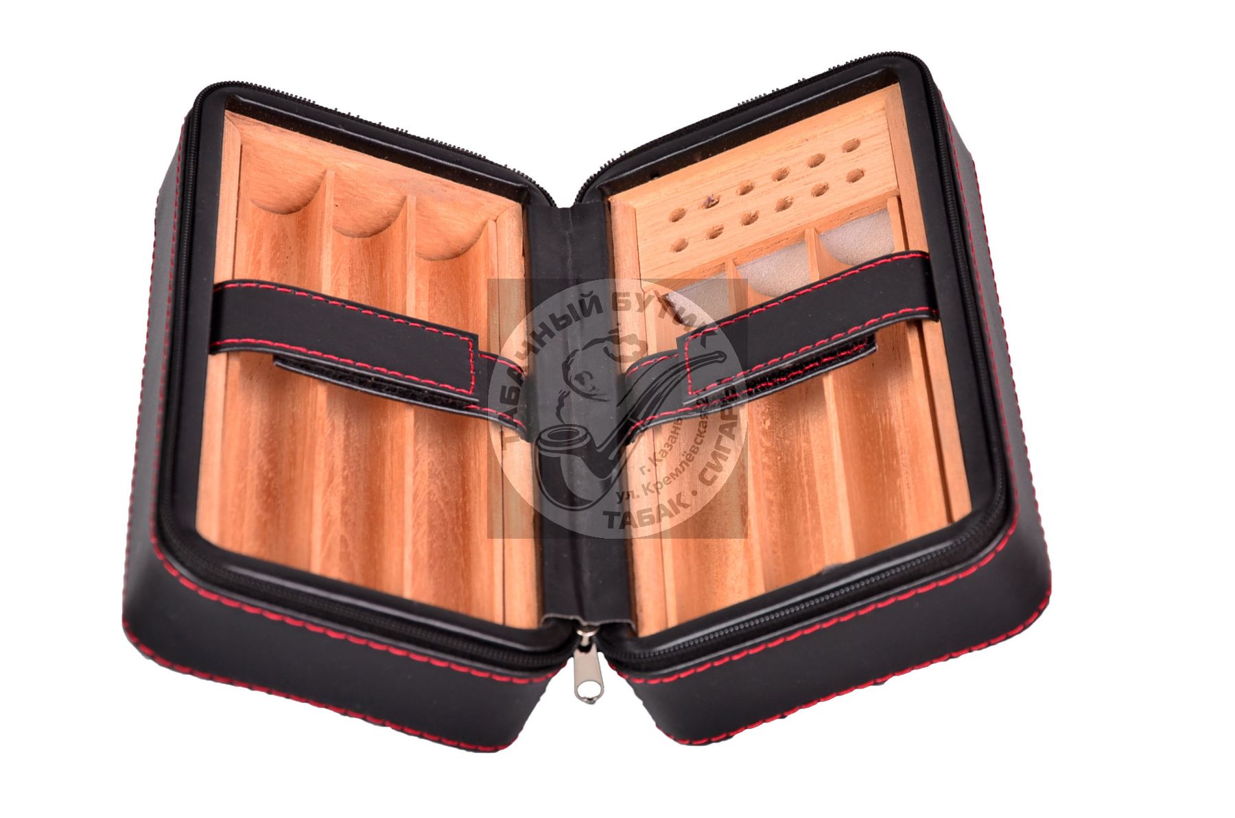 Хьюмидор дорожный на 6 сигар тайваньской марки Tom River. Внутренняя отделка -«Испанский» кедр из Латинской Америки, снаружи — экокожа. В комплекте увлажнитель, съемный ложемент из кедра, инструкция по уходу.
