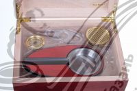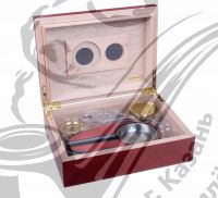 Хьюмидор на 20 сигар тайваньской марки Tom River в наборе с пепельницей и гильотиной. Внутренняя отделка -«Испанский» кедр из Латинской Америки, снаружи — ламинация Красное дерево. В комплекте увлажнитель с биогубкой, гигрометр, пепельница, гильотина, инструкция по уходу.