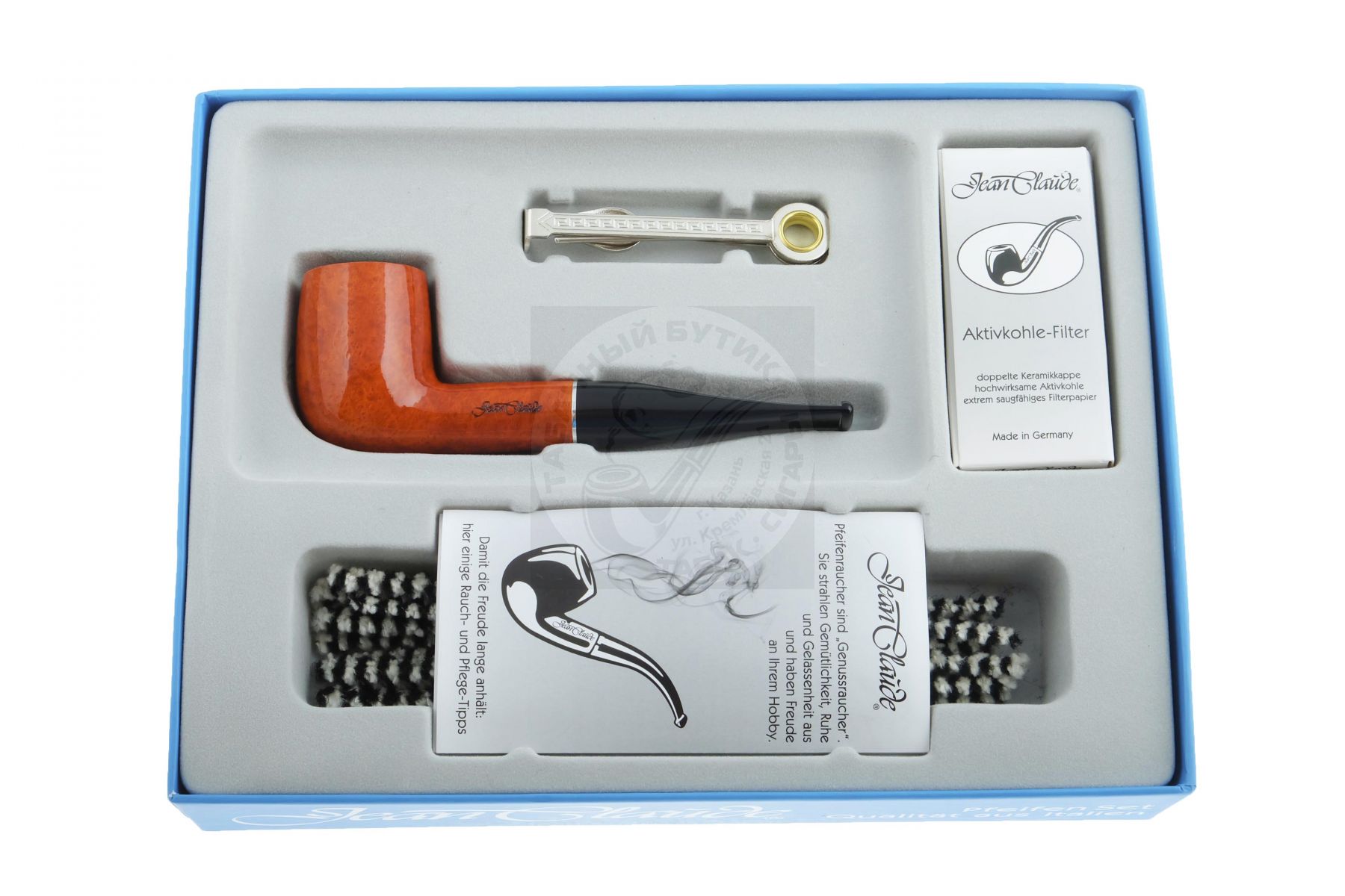 Набор начинающего трубокура Jean Claude в дисплее. В составе набора: Итальянская трубка из бриара с акриловым мундштуком под фильтр 9 мм, инструмент для ухода за трубкой (тройник), 10 конических ершиков, 10 угольных фильтров, брошюра-инструкция по курению трубки на английском и немецком языках.
