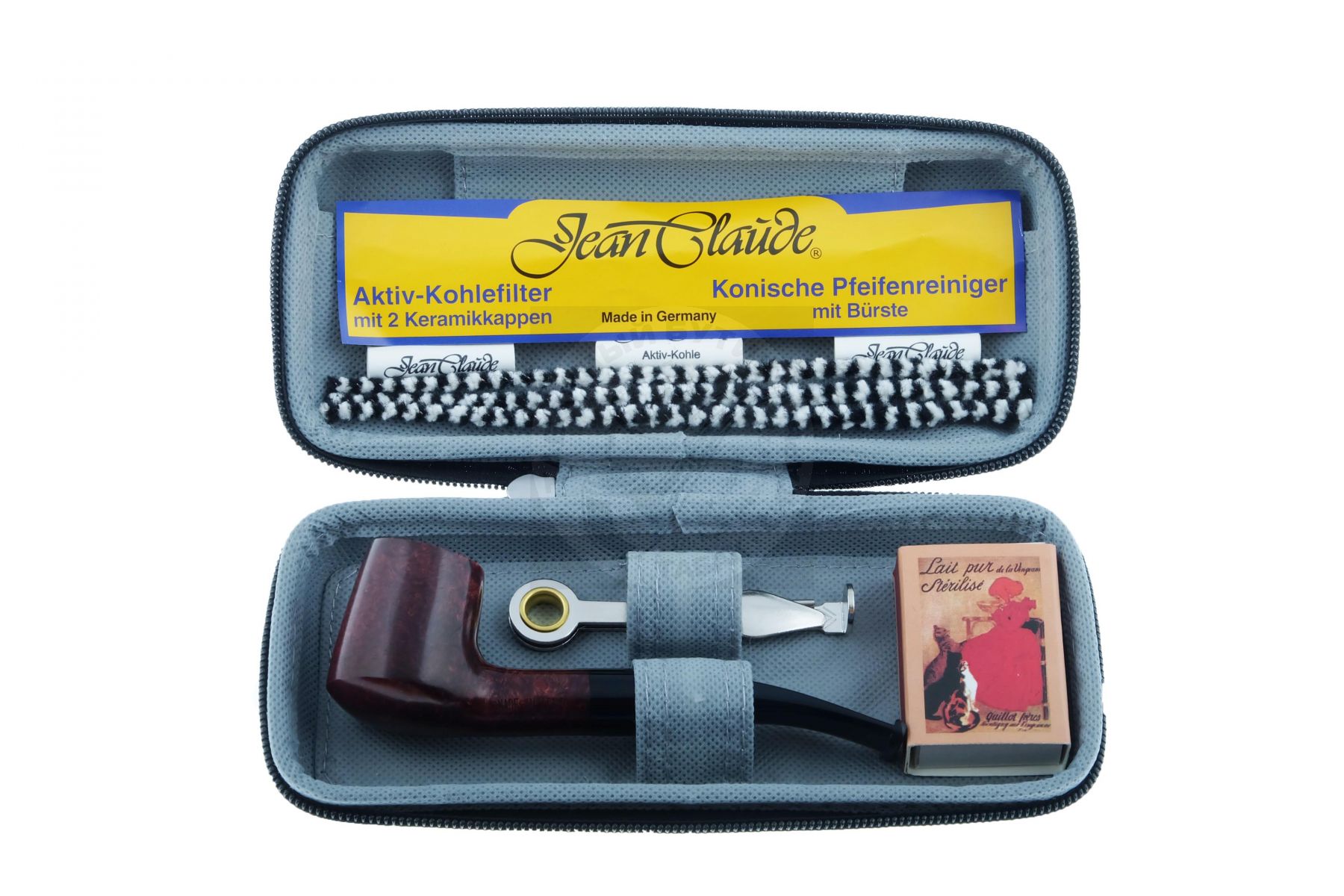 Набор начинающего трубокура Jean Claude в жестком футляре. В составе набора: Итальянская трубка из бриара с акриловым мундштуком под фильтр 9 мм, инструмент для ухода за трубкой (тройник), коробок спичек, 3 конических ершика, 3 угольных фильтра, брошюра-инструкция по курению трубки на английском и немецком языках.