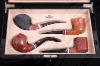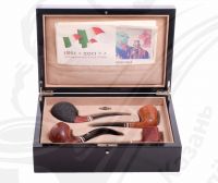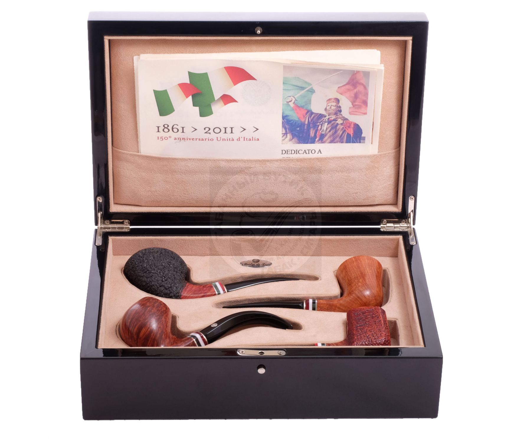 Подарочный набор из 4 трубок «Герои Италии» был выпущен ограниченной серией (30 экземпляров) в 2011 году к 150-летию объединения Италии. Каждая трубка посвящена одному из главных действующих лиц- героев «Рисорджименто» Трубка «Джузеппе Гарибальди» — черный рустик: Фильтр 9 мм. Вес 66 гр. Длина трубки 16 см. Диаметр табачной камеры 20 мм., глубина 45 мм. Трубка «Джузеппе Мадзини»- коричневый бласт: Фильтр 9 мм. Вес 49 гр. Длина трубки 14 см. Диаметр табачной камеры 20 мм., глубина 45 мм. Трубка «Витторио Эммануэле»- темный гладкий бриар: Фильтр 9 мм. Вес 67 гр. Длина трубки 14 см. Диаметр табачной камеры 20 мм., глубина 45 мм. Трубка «Камилло Кавур»- натуральный светлый бриар: Фильтр 9 мм. Вес 54 гр. Длина трубки 14 см. Диаметр табачной камеры 20 мм., глубина 45 мм. Кольца трубок из цветного акрила выполнены в цветах Итальянского флага. К набору прилагается буклет на итальянском и английском языках с кратким описанием.