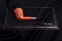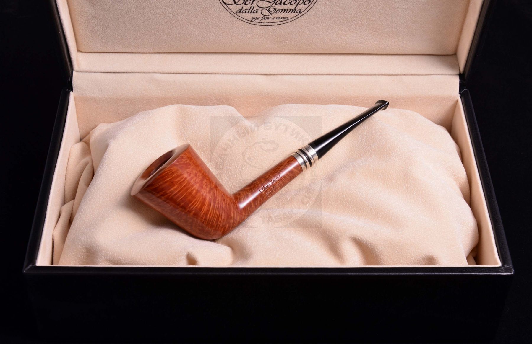 Легкая и элегантная трубка высшего уровня Fiammata в классификации Ser Jacopo. Fiammata означает плотный равномерный рисунок «венатуры» бриара по всей чашке, похожий на пламя (la fiamma) , что встречается довольно редко и ценится высоко. Экстраординарность трубки подчеркивается украшением мундштука драгоценным камнем (изумрудом) в серебряной оправе вместо обычной буквы J. Двойное кольцо на мундштуке и чубуке выполнено из серебра 925 пробы. Трубка была сделана еще в начале 90-х годов самим Giancarlo Guidi и до недавнего времени находилась в частной коллекции в Италии. Единственный экземпляр ! Фильтр 3 мм. Вес 40 грамм. Длина трубки 15 см. Диаметр табачной камеры 20 мм., глубина 44 мм. В комплекте подарочная шкатулка из натуральной кожи, кисет для трубки и буклеты компании Ser Jacopo.