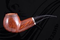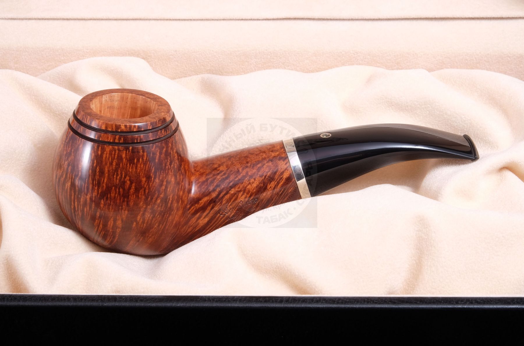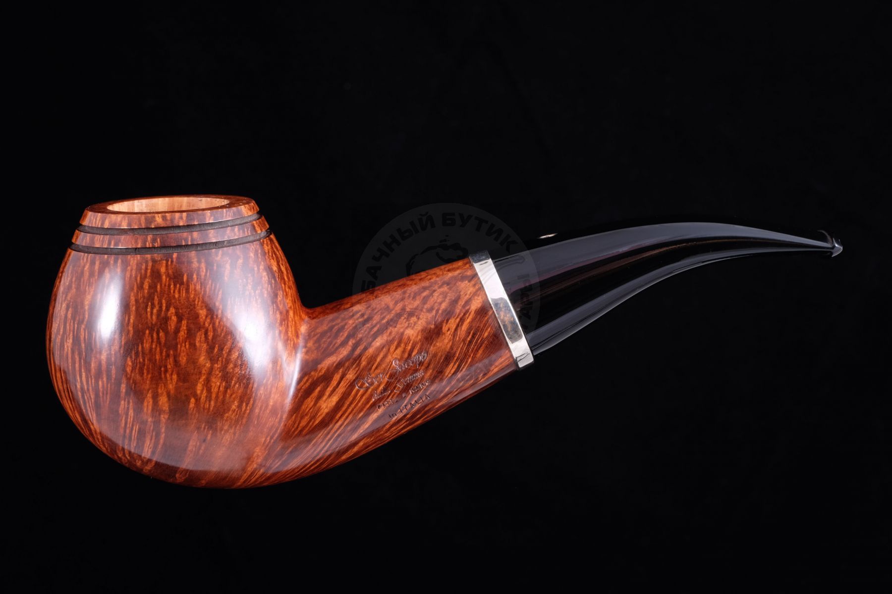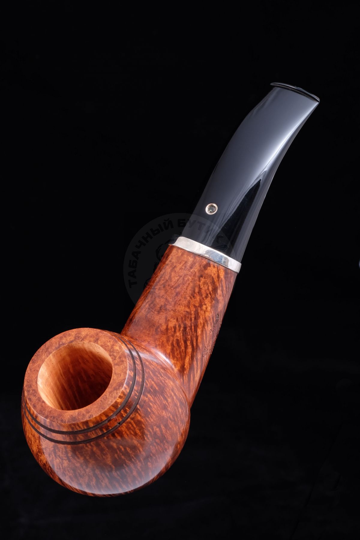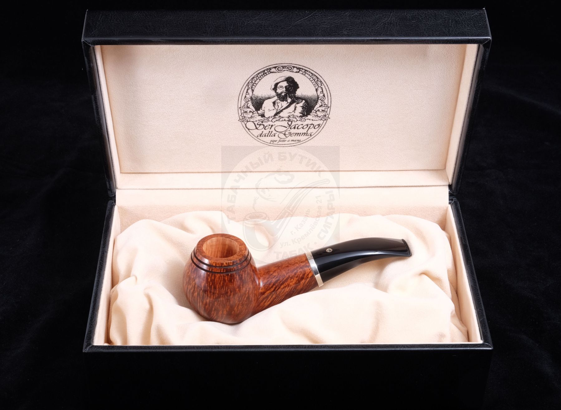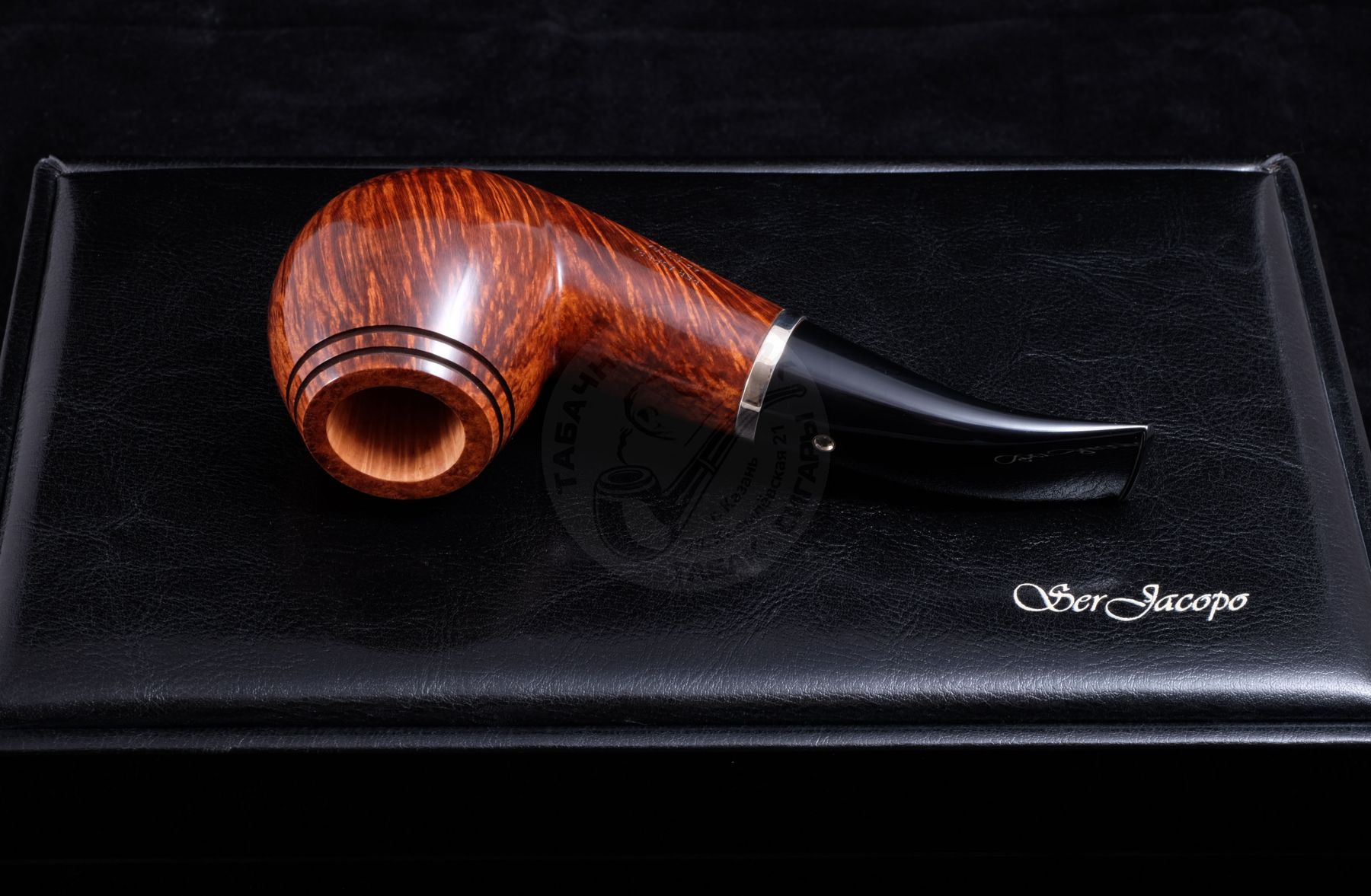Трубка оригинальной формы Freehand высшего уровня Fiammata в классификации Ser Jacopo. Цвет бриара — L1 marronenero (темная двухцветная морилка на растительной основе) . Fiammata означает плотный равномерный рисунок «венатуры» бриара по всей чашке, похожий на пламя (la fiamma), что встречается редко и ценится высоко. Экстраординарность трубки подчеркивается украшением мундштука драгоценным камнем — изумрудом в серебряной оправе вместо обычной буквы J. Трубка особо крупного размера Maxima. Bыполнена в единственном экземпляре. Мундштук — акрил. Кольцо на мундштуке — из серебра 925 пробы. Фильтр 9 мм. Вес 101 грамм. Длина трубки 15 см. Диаметр табачной камеры 20 мм., глубина 45 мм. В комплекте подарочная шкатулка из натуральной кожи, кисет для трубки и буклеты компании Ser Jacopo купить в Казанги