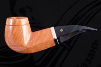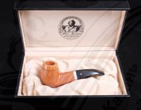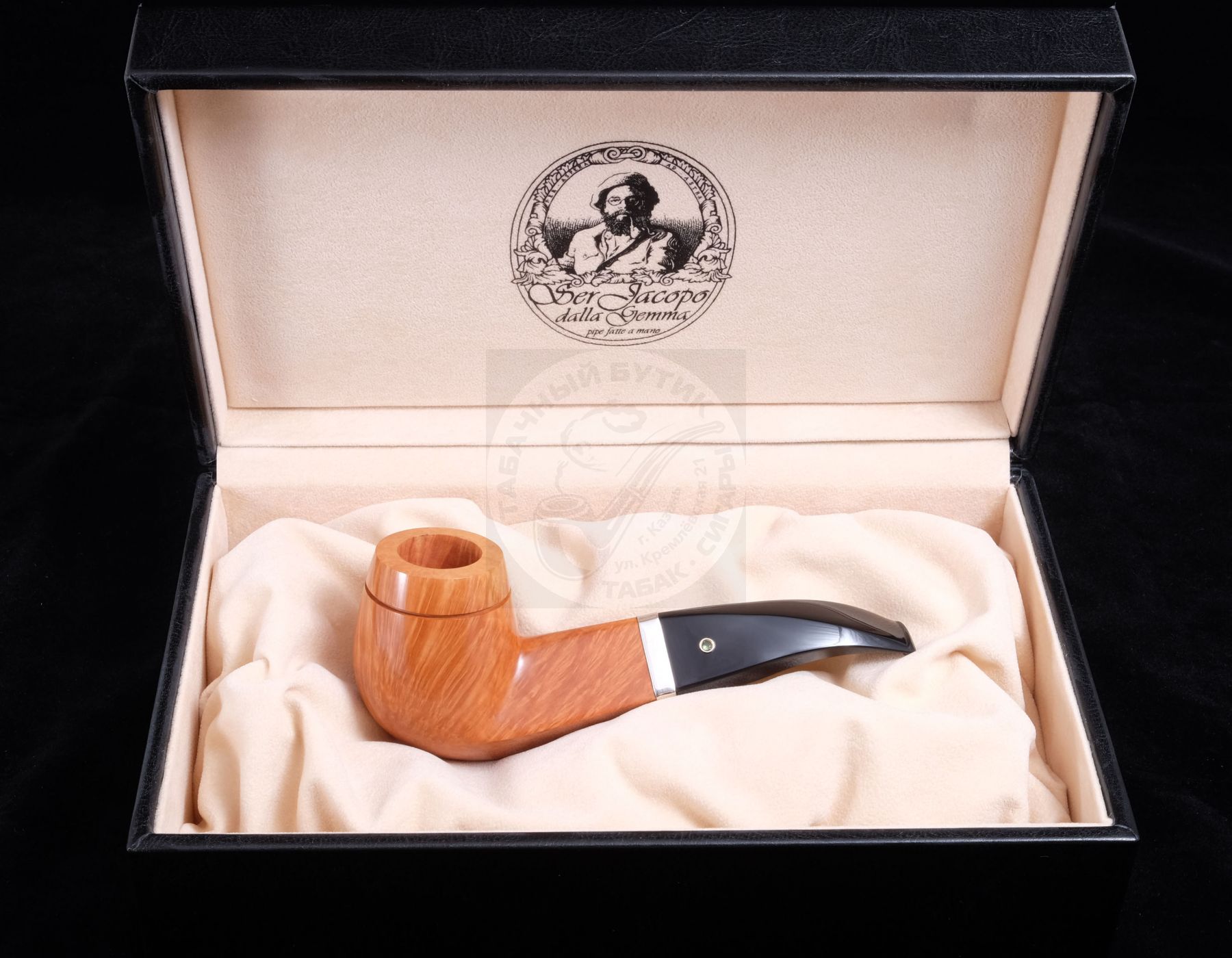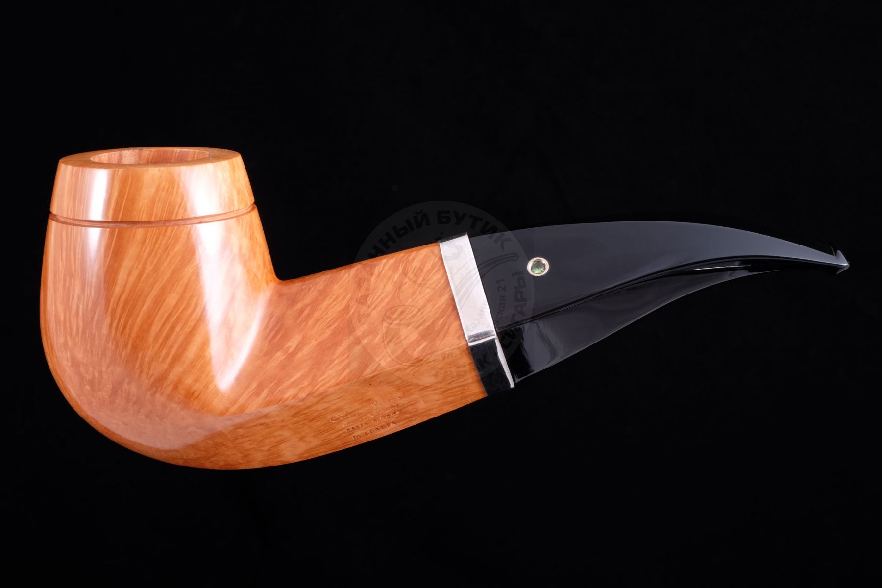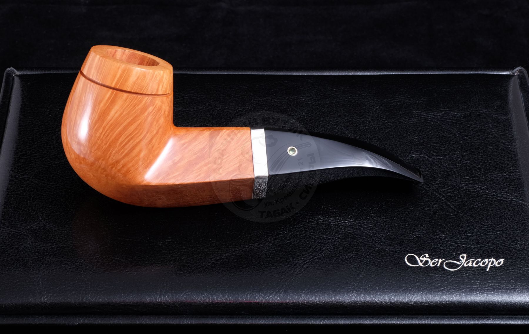 Трубка оригинальной формы Freehand высшего уровня Fiammata в классификации Ser Jacopo. Цвет бриара — naturale (натуральный) . Fiammata означает плотный равномерный рисунок «венатуры» бриара по всей чашке, похожий на пламя (la fiamma), что встречается редко и ценится высоко. Экстраординарность трубки подчеркивается украшением мундштука драгоценным камнем — изумрудом в серебряной оправе вместо обычной буквы J. Трубка особо крупного размера Maxima. Bыполнена в единственном экземпляре. Мундштук — акрил. Кольцо на мундштуке — из серебра 925 пробы. Фильтр 9 мм. Вес 100 грамм. Длина трубки 15 см. Диаметр табачной камеры 20 мм., глубина 48 мм. В комплекте подарочная шкатулка из натуральной кожи, кисет для трубки и буклеты компании Ser Jacopo.