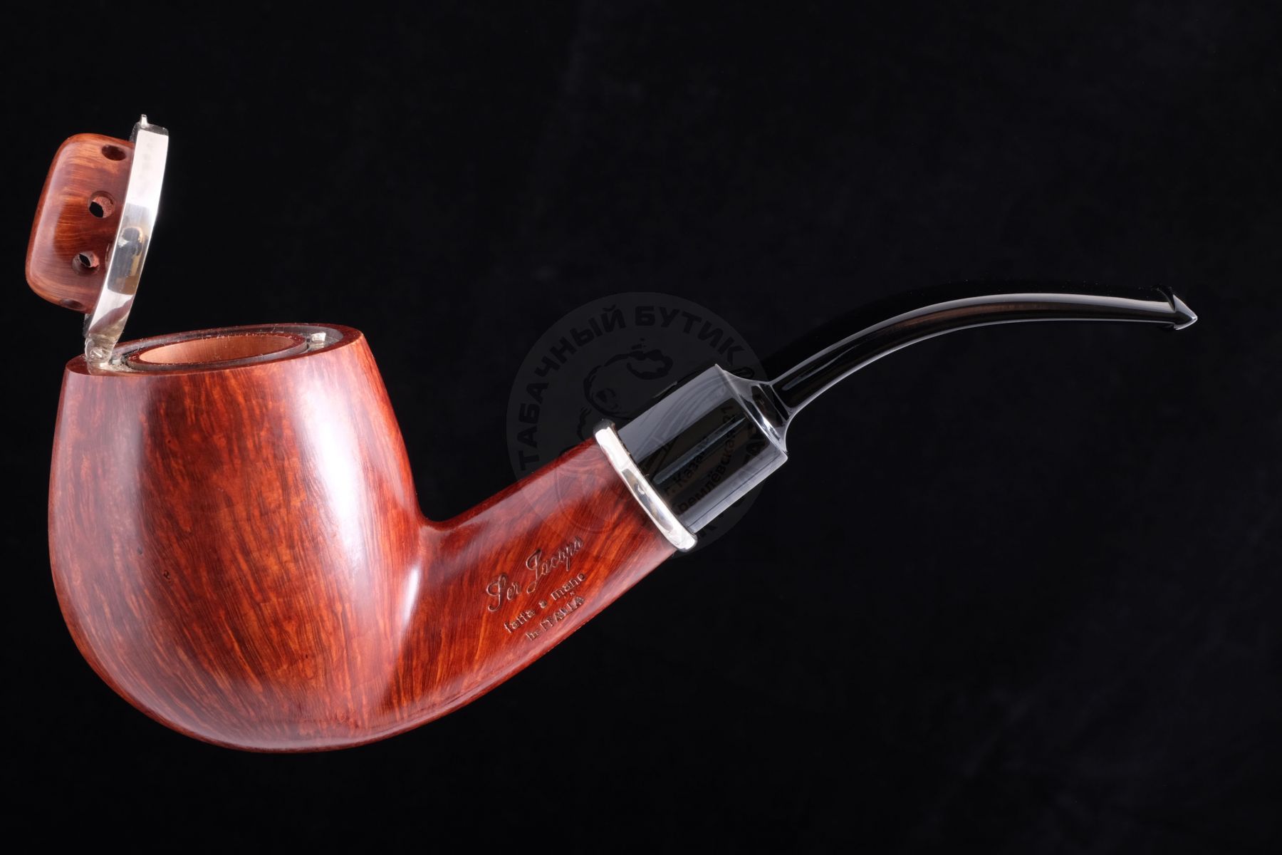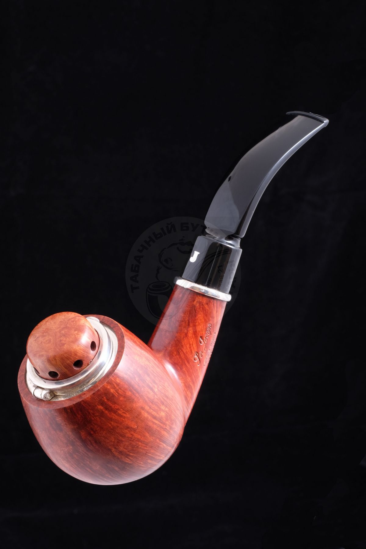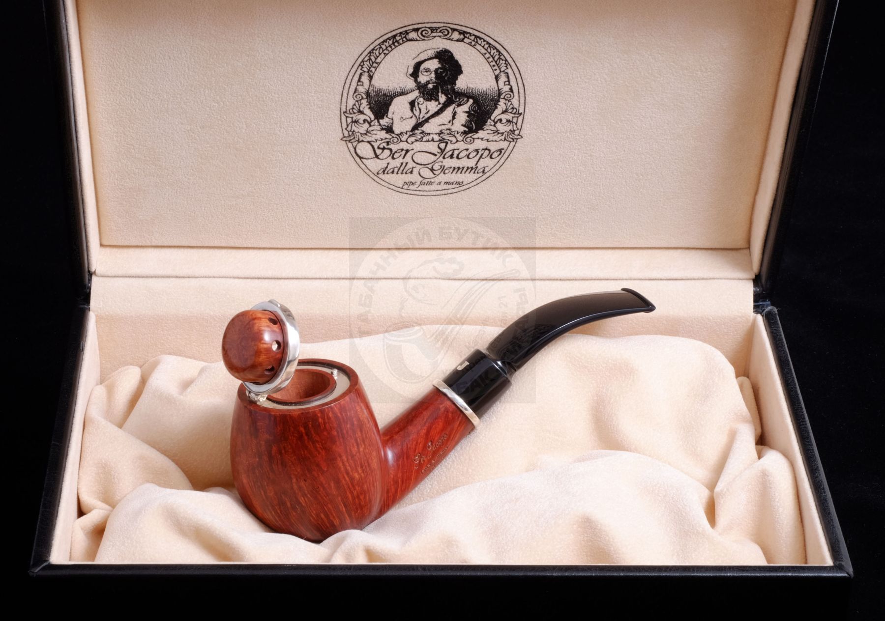 Трубка SER JACOPO Historica DOME. Из исторической серии ранних работ Джанкарло Гуиди — основателя SER JACOPO. Форма чашки с крышкой из серебра и бриара напоминает купола итальянских соборов — Duomo (ит.) или Dome (англ.). Модель была изготовлена ограниченной серией в 100 шт. Данная трубка имеет № 28. Фильтр 9 мм. Вес 98 грамм. Длина трубки 15 см. Диаметр табачной камеры 20 мм., глубина 45 мм. В комплекте подарочная шкатулка из натуральной кожи, кисет для трубки и буклеты компании Ser Jacopo.