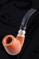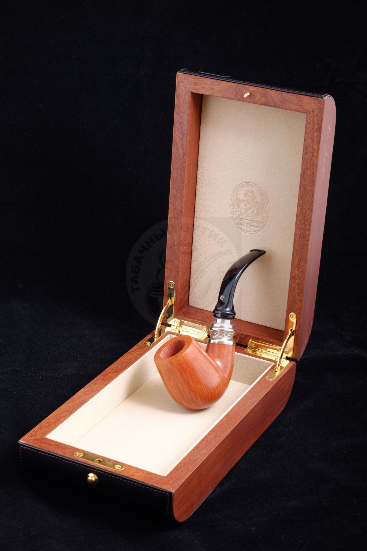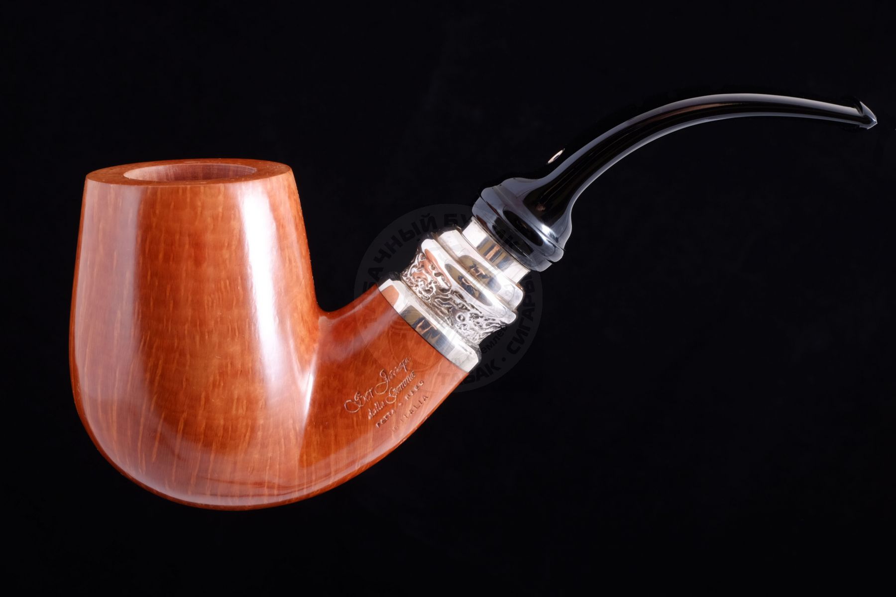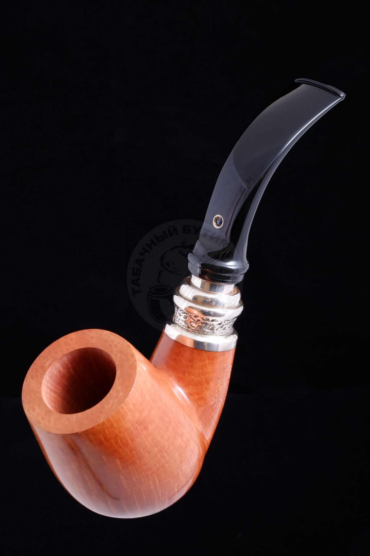 Трубка с классическими идеальными пропорциями высшего уровня Fiammata в классификации Ser Jacopo. Fiammata означает плотный равномерный рисунок «венатуры» бриара по всей чашке, похожий на пламя (la fiamma), что встречается довольно редко и ценится высоко. Экстраординарность трубки подчеркивается украшением мундштука драгоценным камнем (сапфиром) в серебряной оправе вместо обычной буквы J. Двойное кольцо на чубуке и мундштуке модели Pulchra (Пулькра) выполнено из массива серебра 925 пробы. Трубка выполнена в единственном экземпляре. В комплекте подарочная шкатулка Gentili из дерева и натуральной кожи, кисет для трубки, буклеты компании Ser Jacopo. Фильтр 9 мм. Вес 85 грамм. Длина трубки 16 см. Диаметр табачной камеры 20 мм., глубина 50 мм.